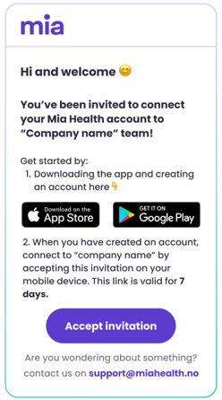 - Via Email: The user opens the email sent from Mia Health on their mobile device (where the app is installed) and clicks the "Accept invitation" button. This is a quick and easy method for individual invitations.