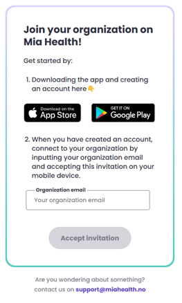 - Via Web Link: The user opens the link join.miahealth.no in the browser on their mobile device (where the app is installed) and enters the email address they were invited with into the "Email address" field before clicking "Accept invitation." This is ideal for bulk invitations and event triggered invitations.