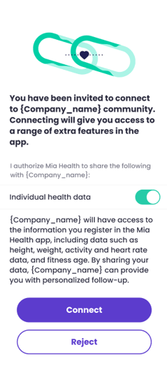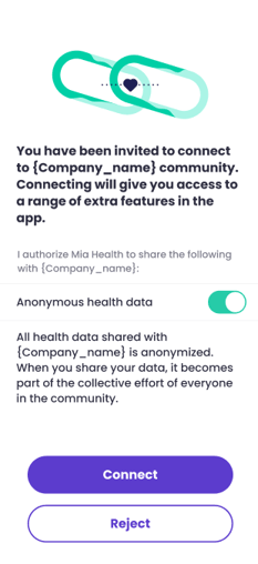 Regardless of how the user accepts the invitation, the Mia Health app will open, and a pop-up window will appear where the user can check the box to share "Anonymous health data" or "Individual health data" and click "Connect."
