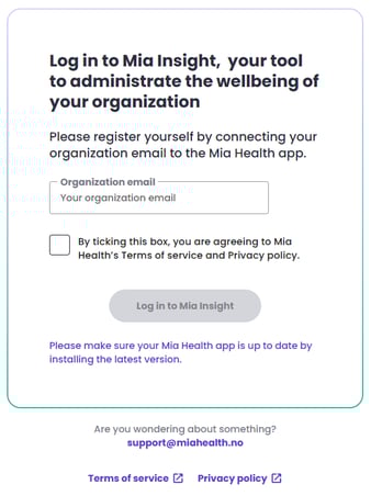 Enter the email address associated with your registration (Note: This may differ from your personal Mia Health app user email), check the box to acknowledge acceptance of the privacy policy and terms, and click the "Log in to Mia Insight" button.