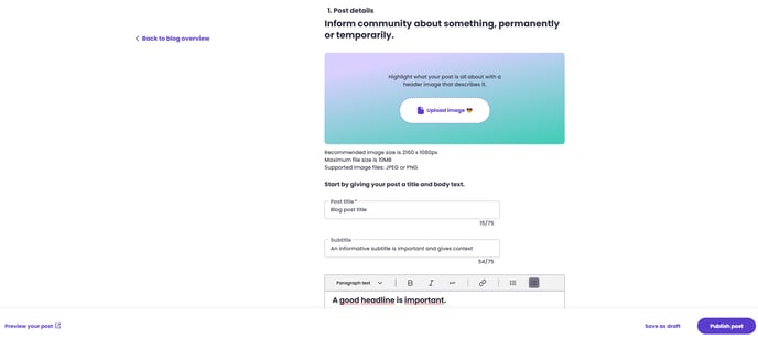 When you are finished and ready to publish, click the "Publish post" button in the lower right corner. The blog post will then be immediately shared with the defined target audience in the Mia Health app.