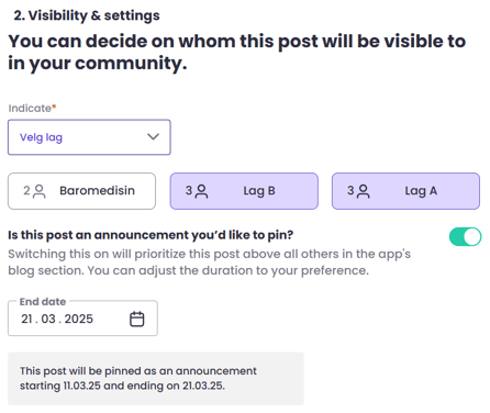 Before sending out the blog post, you can also define visibility and distribution. You can choose to send to the entire organization, or to members of various teams or the attributes in the attribute categories. You can also choose whether the blog post should be pinned at the top and, if so, for how long.