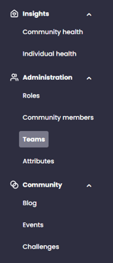 Dividing your company, project-, patient-, or training groups into teams and assigning attributes makes communication, engagement, and follow-up easier. Teams and attributes can be used both when viewing "Community Health" and for creating, sharing and sending "Event," "Blogs," and "Challenges."