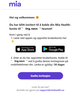 - Brukeren åpner e-posten som blir sendt ut fra Mia Health via mobil (enheten der appen er installert) og klikker på "Godta invitasjon"-knappen. Rask og enkel for 1-1 invitasjoner.