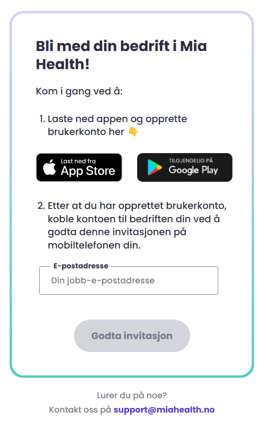 - Brukeren åpner da lenken join.miahealth.no i nettleseren på mobilen (enheten der appen er installert) og fyller inn e-postadressen man er invitert med i "E-postadresse"-feltet før man trykker "Godta invitasjon". Perfekt for bulk-invitasjoner.