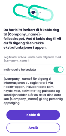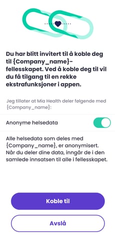Uavhengig av hvordan brukeren godtar invitasjonen vil nå Mia Health-appen åpnes opp og man får opp et pop-up-vindu der man haker av for deling av "Anonyme helsedata" eller "Individuelle helsedata" og trykker "Koble til". Type datadeling avhenger av om du tilkobles en bedriftsorganisasjon eller en helsetilbyder.