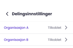 - Hen velger deretter "Delingsinnstillinger" og finner sin organisasjon i listen. Der ser hen også status på tilkoblingen.
