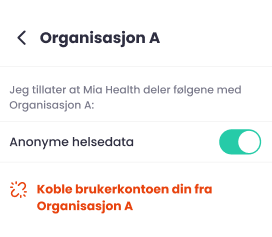 - Her kan hen velge å "Koble fra" brukerkontoen sin eller slå av/på deling av "Anonyme helsedata" / "Individuelle helsedata".