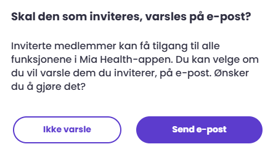 Når du er klar for å få alle medlemmer til å ta i bruk systemet og koble seg til Mia Insight, klikker du på knappen "Inviter" bak navnet på det individuelle medlemmet. Du vil da få valget om å varsle medlemmet med en egen e-post via "send e-post" eller du kan velge å "ikke varsle".