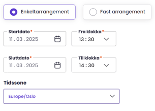 For enkeltstående arrangementer velger du startdato og sluttdato (kan være samme dag eller gå over flere dager) og fra/til klokkeslett, før du velger tidssonen du er i.
